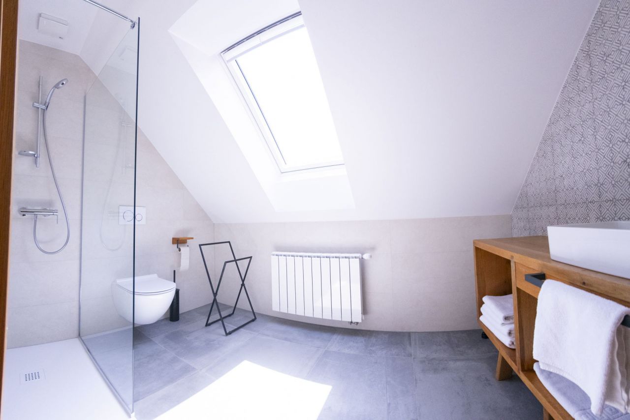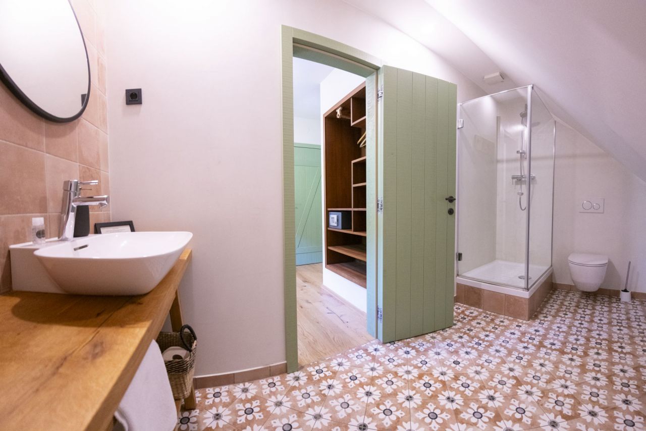 is located on the 1st floor, has an attic, has two bedrooms with private bathrooms, and also offers access to a balcony and pets are allowed. Double room 2 with a balcony measures 32m2.